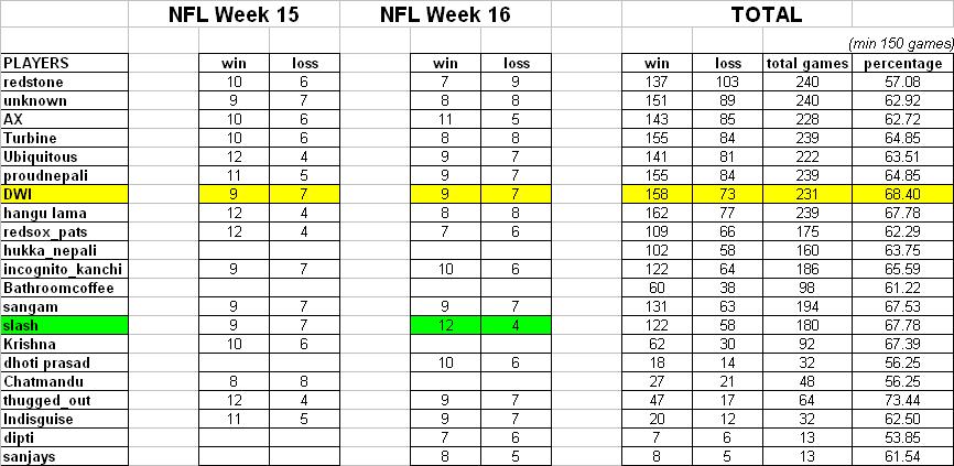 here's the week 16 results....