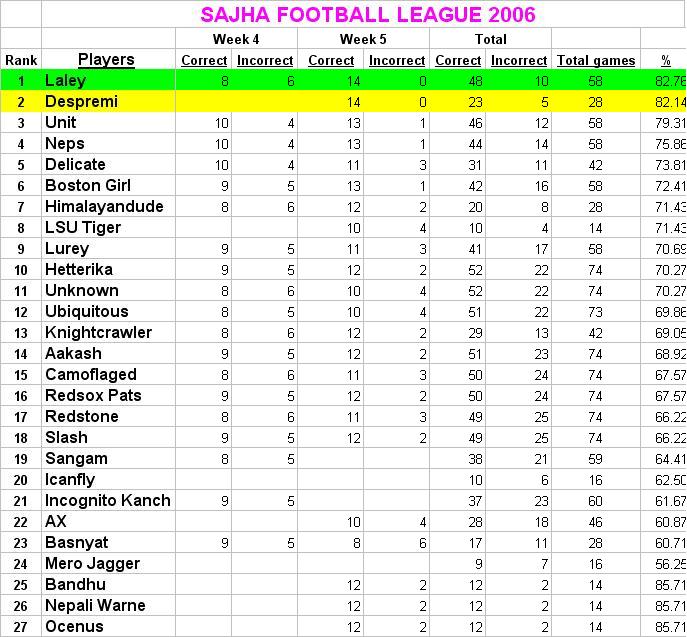 Slash bro, its just the human nature that you don't get satisfied for what you have!!!! am i right??? :-) redstone bro, am I getting that really annoying to ya'll?? lol ... naa.. i'm just talking lound to encourage you folks...not out of jealousy... and have i started early ..maybe I could have even higher rating..who knows lol :-) just being optimistic... so just be glad that I started late..lol plus...hey..maybe...UNKNOWN has different personality and perspective in expressing his winning status than mine. So that does not mean that i have to act like UNKNOWN whenever i get 14-0 or 16-0. For god sake can I atleast enjoy my moment when i'm within the reach!!!! :-) and TO ALL SAJHA FOOTBALL LEAGUE FOLKS: can I PLEASE be refered as SAJHA FOOTBALL LEAGUE PUNDIT LALEY...instead of just LALEY!!!!!! :-) LOL MUCH APPRECIATED, SFL PUNDIT LALEY. wish you all good luxk for predictions for this weekend and mysefl to be the leader once again. :-)