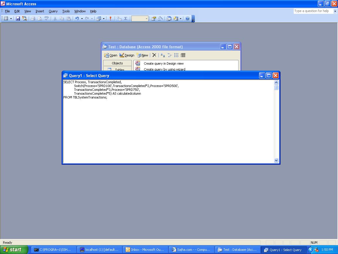 One more thing, I have 4 fields in the table: UserID Process TransactionsCompleted Date Would that be a problem that I'm not including the 2 other column names in the SQL (UserID and Date)?