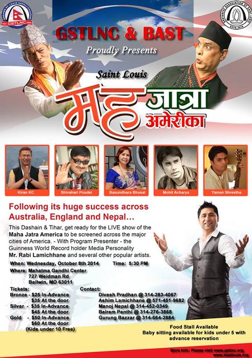 GSTLNC and BAST proudly presents legendary MaHa Jodi in St. Louis coming OCT 8 2014 along with Kiran KC (राता मकै), Shivahari Paudel (मुखा हानु जस्तो), Rabi Lamichhane, Yaman Shrestha, Mohit Acharya and Basundhara Bhusal. Tickets are limited and will be available online through our official website www.gstlnc.org.
