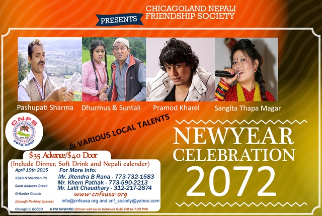 Chicagoland Nepali Friendship Society wishes a Happy New Year 2072 [नयाँ वर्ष २०७२ को शुभकामना] to you and your family. We hope upcoming New Year may bring happiness, peace, good health, successes, long life and prosperity. We would like to announce Nepali New Year Dhamaka 2072 Celebration on April 19th, 2015 [Sunday], 6:00 PM onward at 5649 N Sheridan Rd, Chicago, IL 60660 (Saint Andrew Greek Orthodox Church). We invite you, your family members and friends to participate and enjoy Nepali folk, lok, duet songs, comedy, dances and performance by Pashupati Sharma, Sangita Thapa Magar, Dhurmus & Suntali, Pramod Kharel and our local talents.