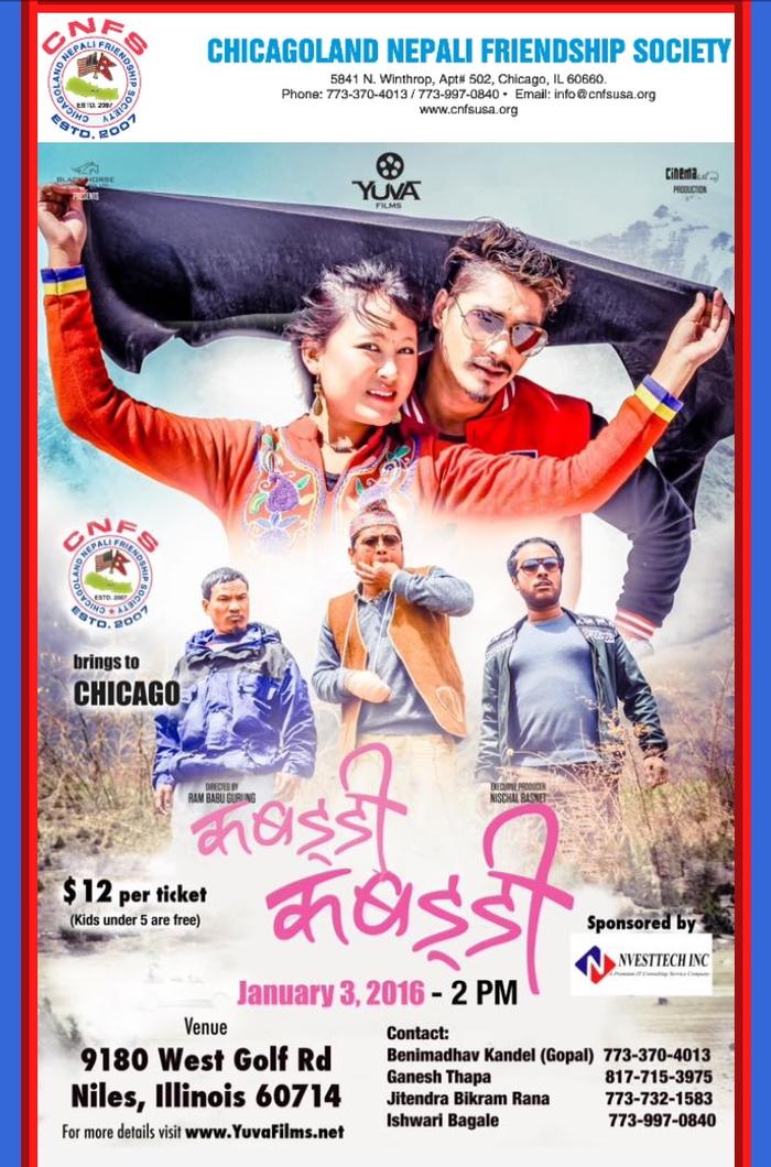 CNFS is going to screen new Nepali movie titled "Kabaddi Kabaddi" on January 3rd, 2015, Sunday at 2:00 PM at Movie Max Cinema (Big Cinema) located on 9180 W Golf Rd, Niles, IL 60714. Please contact below to get your ticket in advance and watch this popular movie with your family and friends to support Nepali film industry. We have one show scheduled and seats are limited.