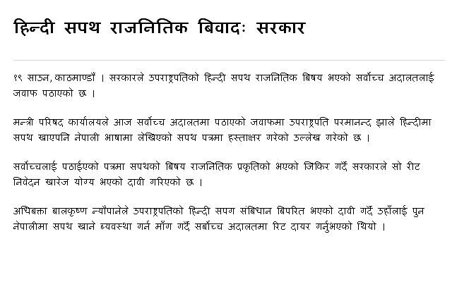 गत साता शनिबारको कुरा हो । कान्तिपुर दैनिकमा एक जना मधेसी मूलका पत्रकार जितेन्द्र साहले उपराष्ट्रपति परमानन्द झाले हिन्दी भाषामा शपथ लिएकामा दुःख व्यक्त गर्दै एउटा लेख लेखेका छन् । हुने भइदिएको भए यसपटकको यो स्तम्भमा साहको सो लेखको पर्ूण्ापाठ नै उद्धृत गरििदन मन लागेको थियो तर त्यो सम्भव नभएकाले यहा“ उनको लेखको एक अनुच्छेद मात्र उद्धृत गर्दैछु ः